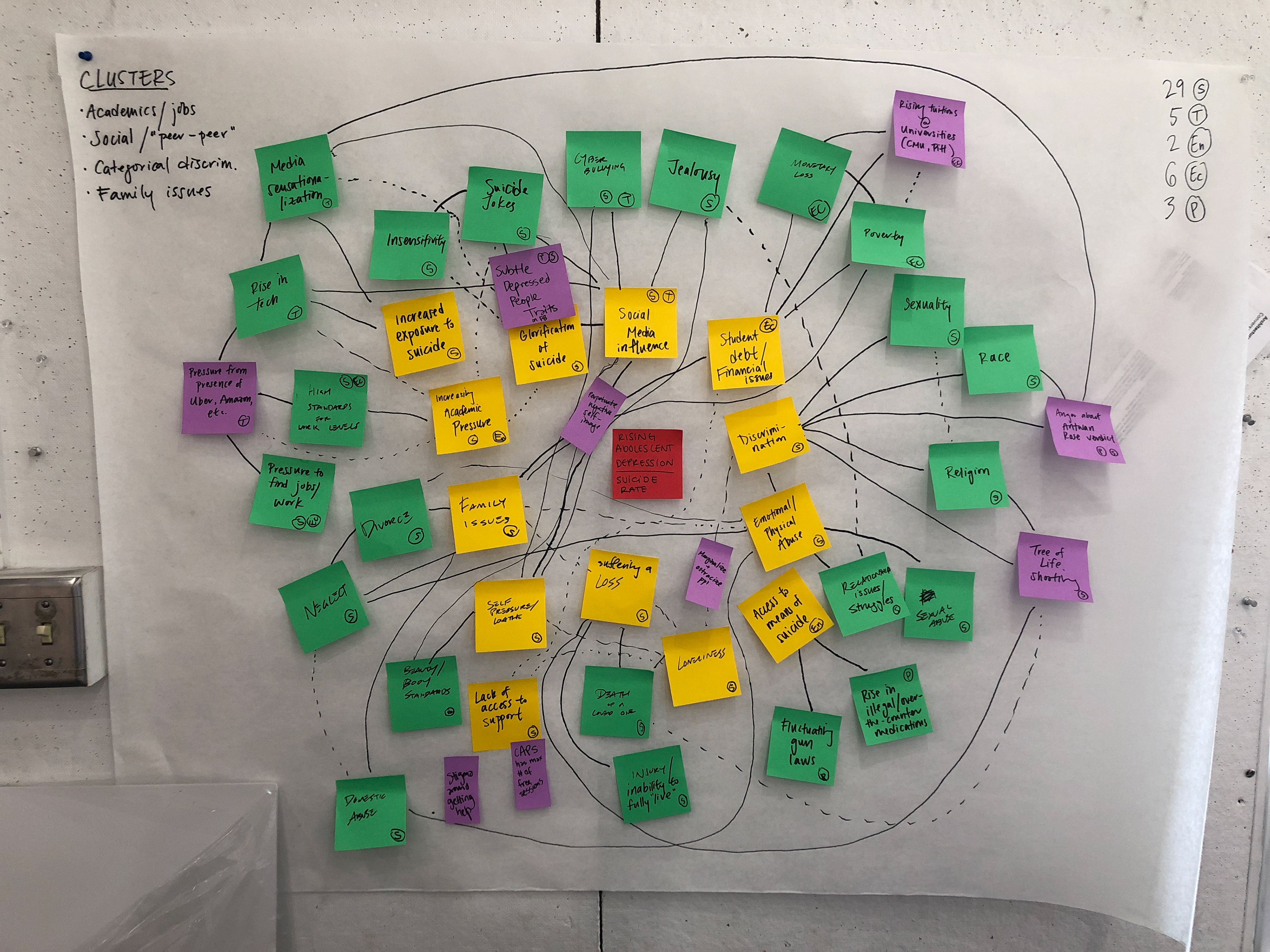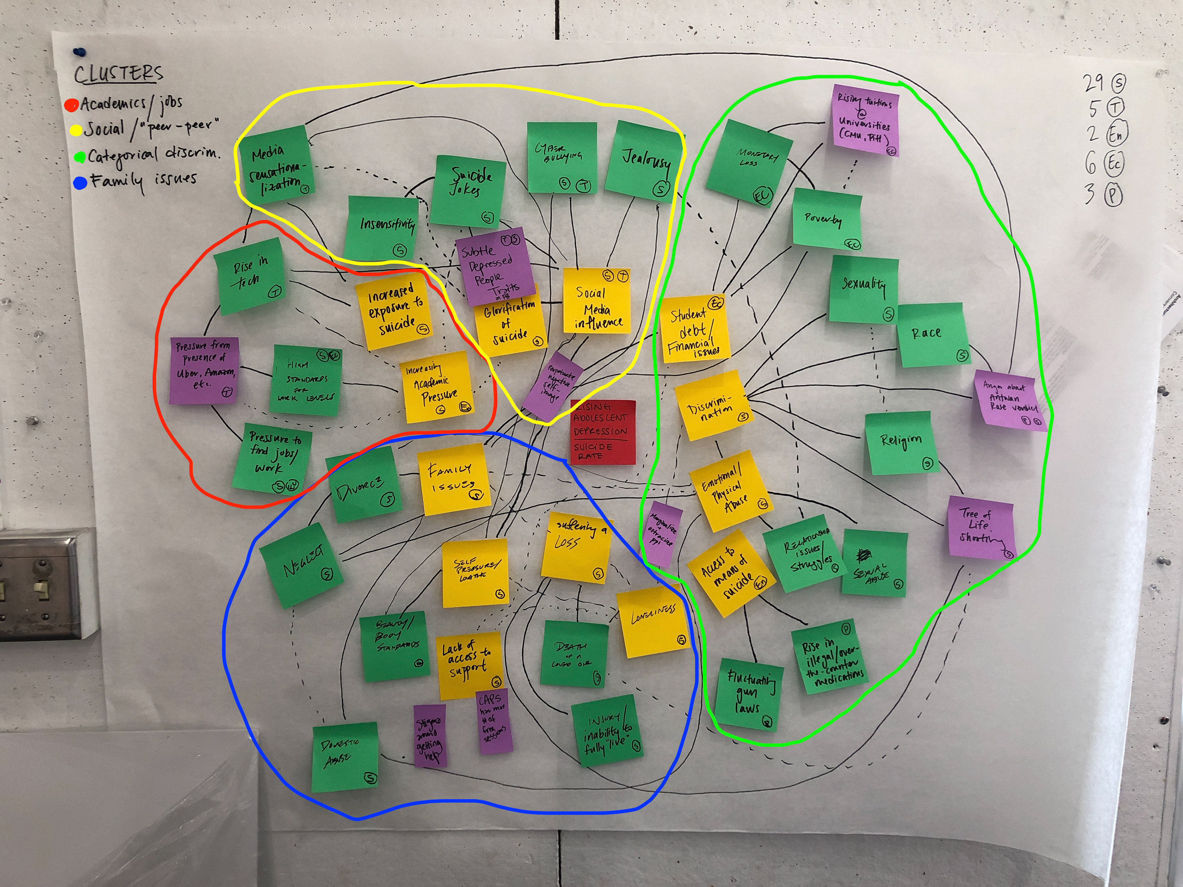 After placing all sticky notes, we used STEEP analysis to find trends in our map. We categorized each sticky note as a Social, Technological, Economical, Environmental, or Political factor (or more than one). Using this analysis we were able to identify four rough clusters among our map: Performance Pressure (academic/job performance), Social Issues (social/peer-peer), Categorical Discrimination, and Family Issues.
